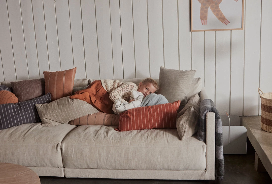 The Kyoto series consists of cushions in many sizes and shapes. The long cushion has a minimalist and nostalgic design with small white stripes. The cushion is available in three different colors. Mix and match for the expression you like.