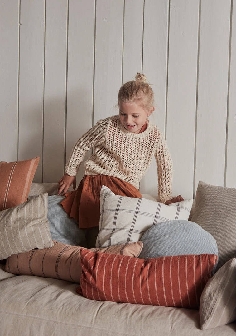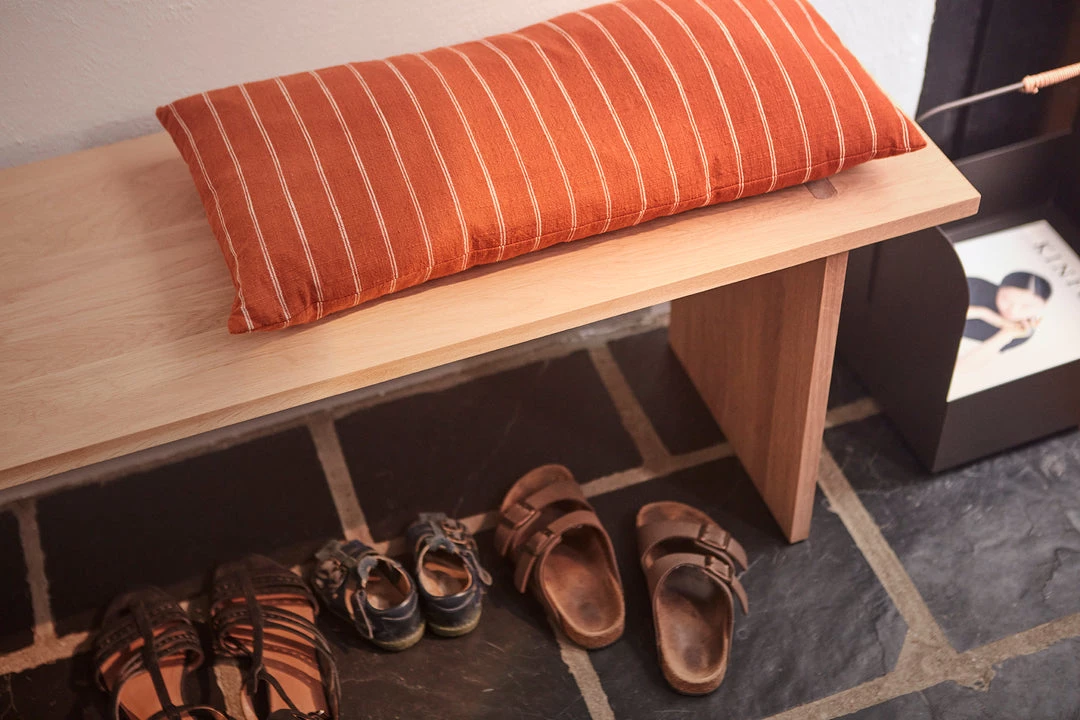 The Kyoto series of cushions comes in many sizes and shapes. The long cushion has a minimalist and nostalgic design with small white stripes. The cushion comes in sienna, anthracite and clay. The Kyoto series is characterized by a graphic expression and has a unique and textured surface.