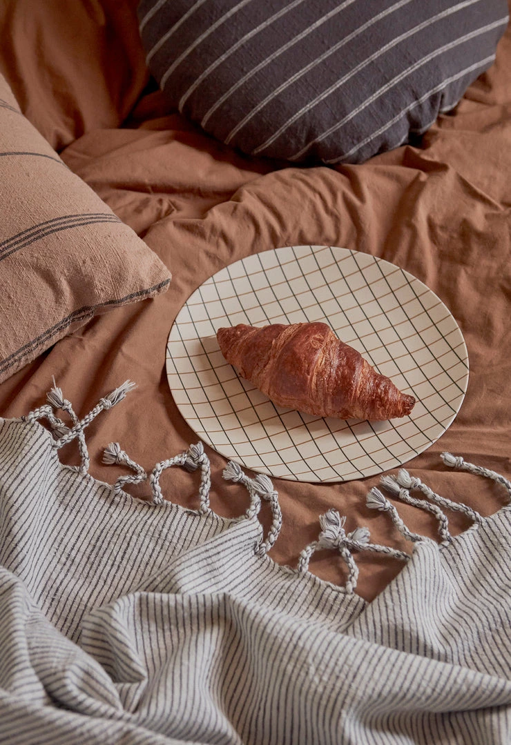 The cushion is woven in organic cotton and is filled with down and feathers. We recommend to wash the cushion cover on 30° machine wash – wash inside out.
