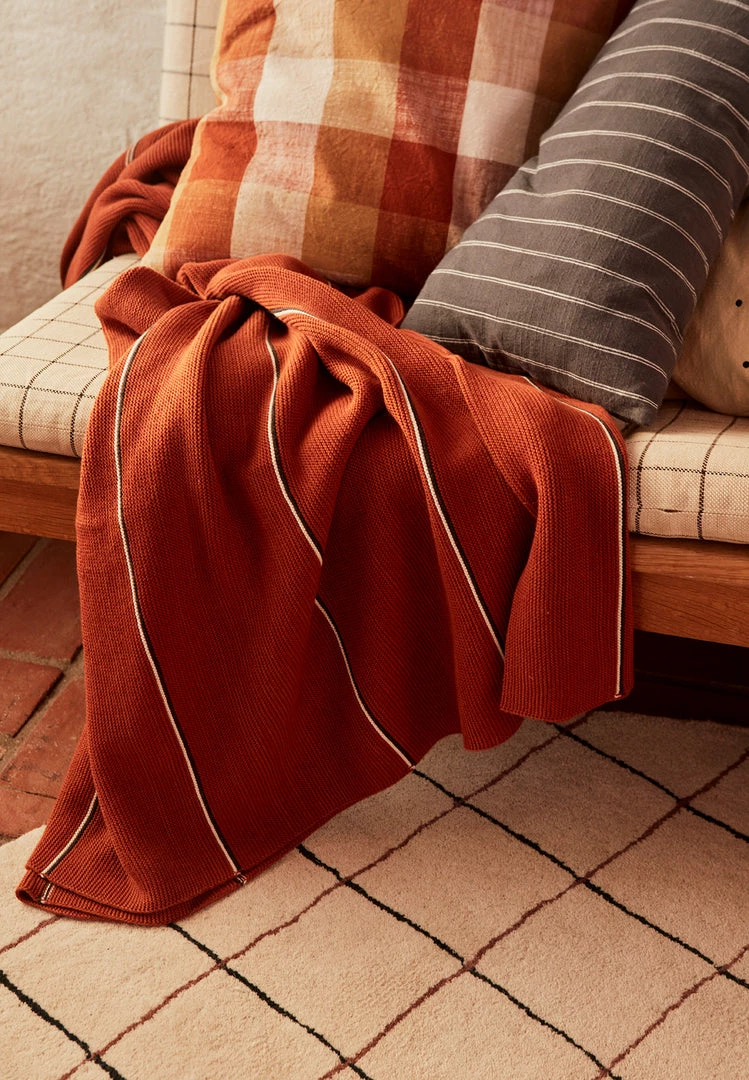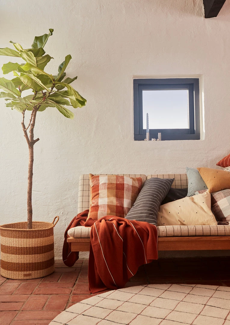 The Kyoto Checker Cushion is woven in organic cotton and is filled with down and feathers. We recommend washing the cushion cover at 30° – wash inside out.
