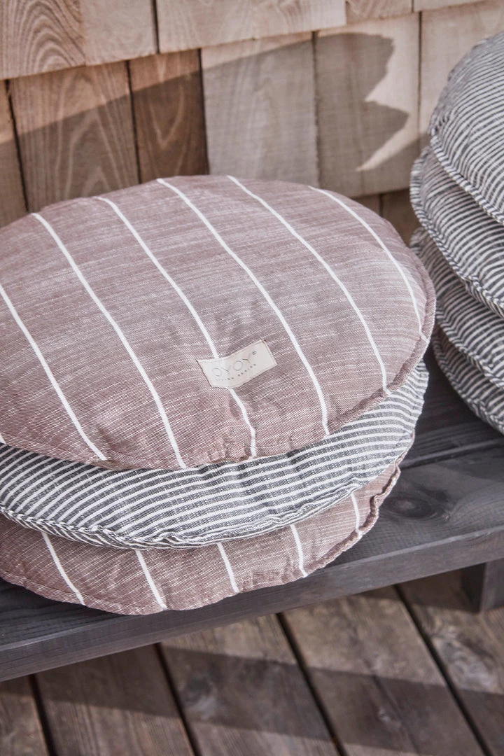 Our Kyoto Outdoor Cushions in recycled polyester are perfect on the terrace or balcony. The round cushion in choko has a simple and recognizable design with stripes, which creates a cosy and personal expression.