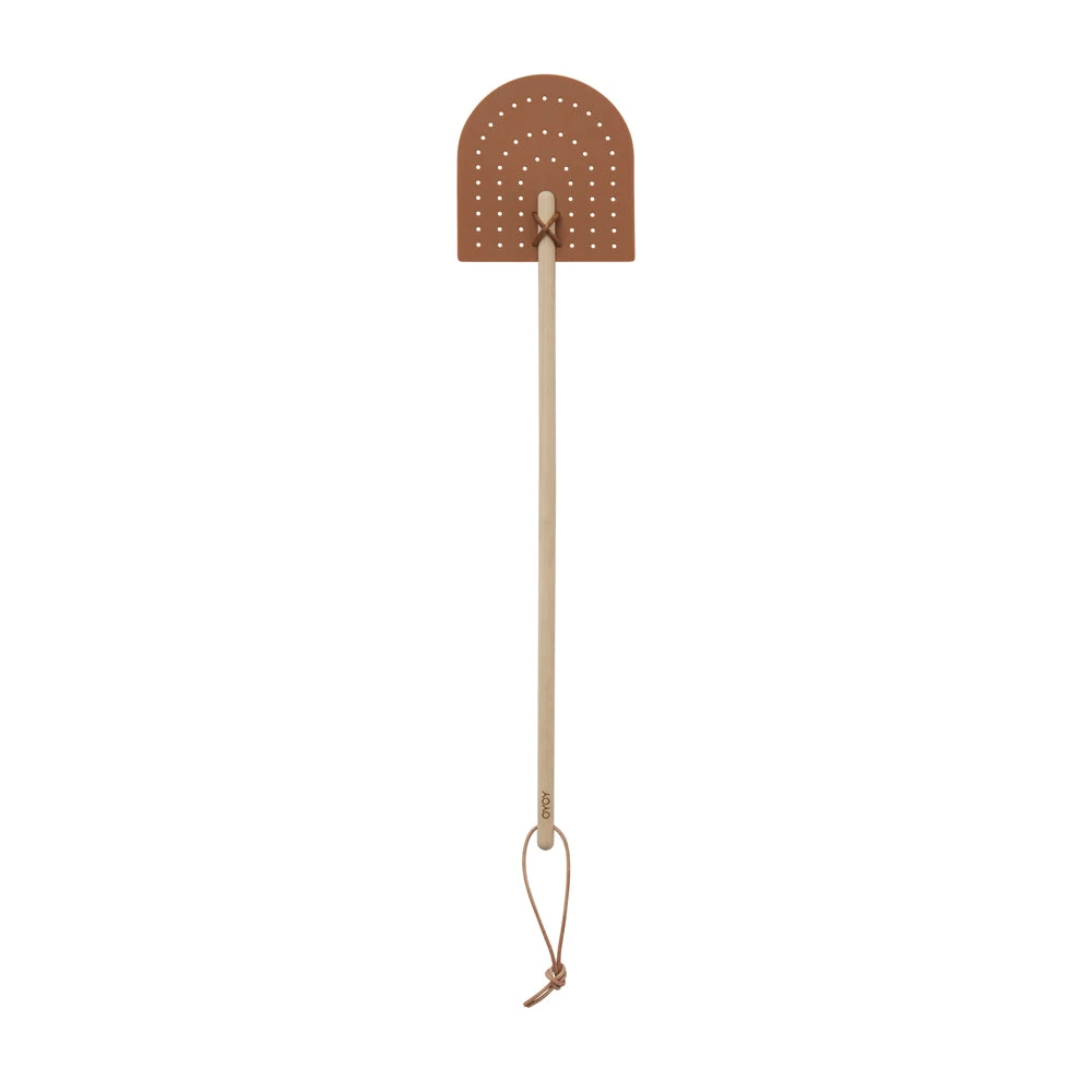 The Rainbow Flyswatter made of ash wood and silicone with a leather string for hanging purpose.