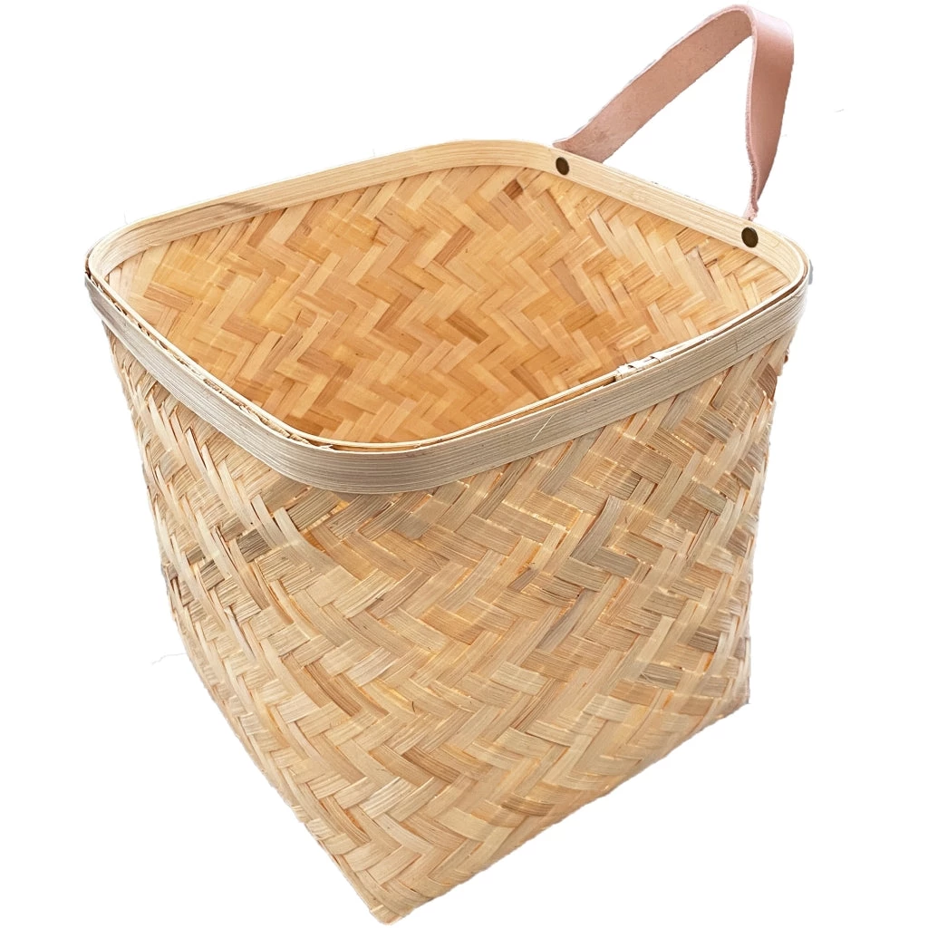 The basket is made of 100% natural bamboo and has a natural leather handle.