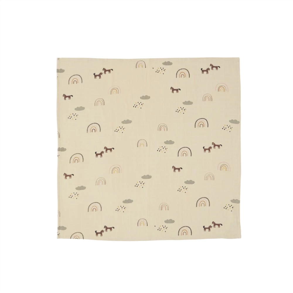 3-pack of muslin cloths for the little girl. 2 of the cloths are solid colored, while the third is made in a cute design with rainbows.