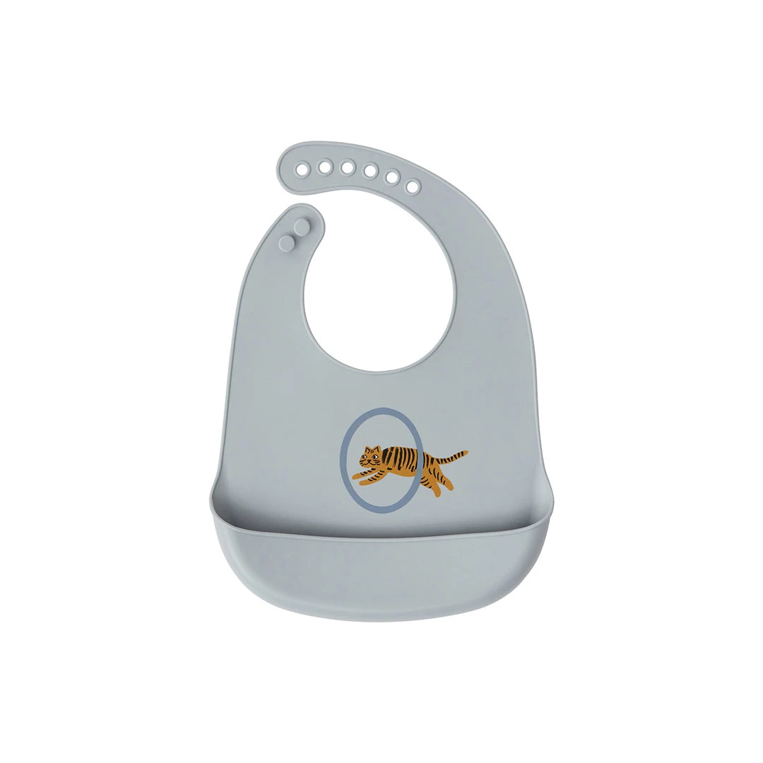 A silicone bib with a practical closing in the neck. The bib is made to gather food and liquids that ensures that the excess food does not run down the clothes. The bib illustrates a cute tiger – Characteristics for much OYOY designs for children.