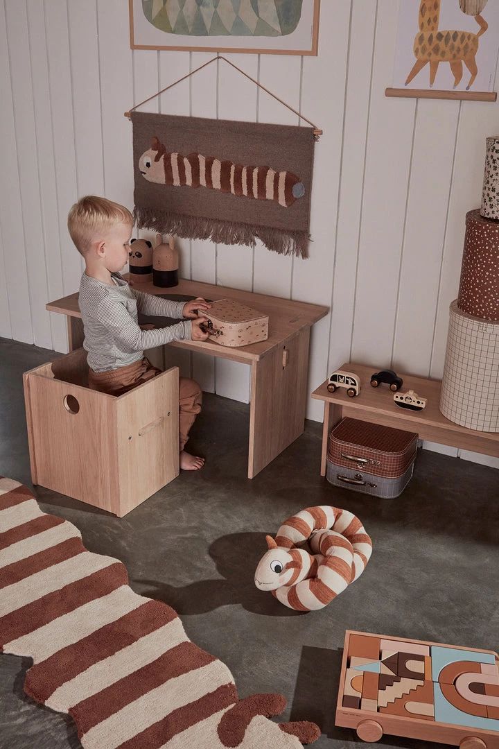 Maybe it will be easier to get up in the morning with a soft rug to step out on. The larva Leo fits perfectly in front of the bed, or in the middle of the children’s room with its long striped body. The rug is made of a soft wool and cotton quality.