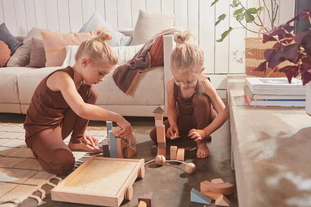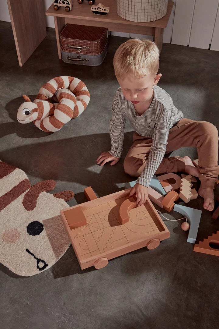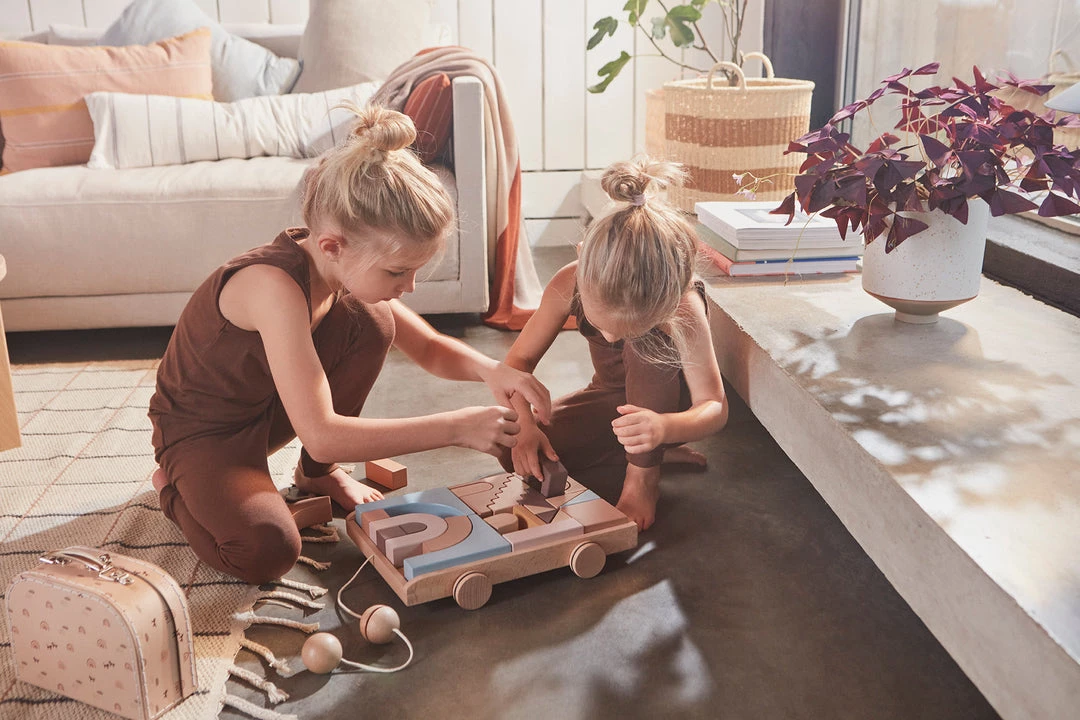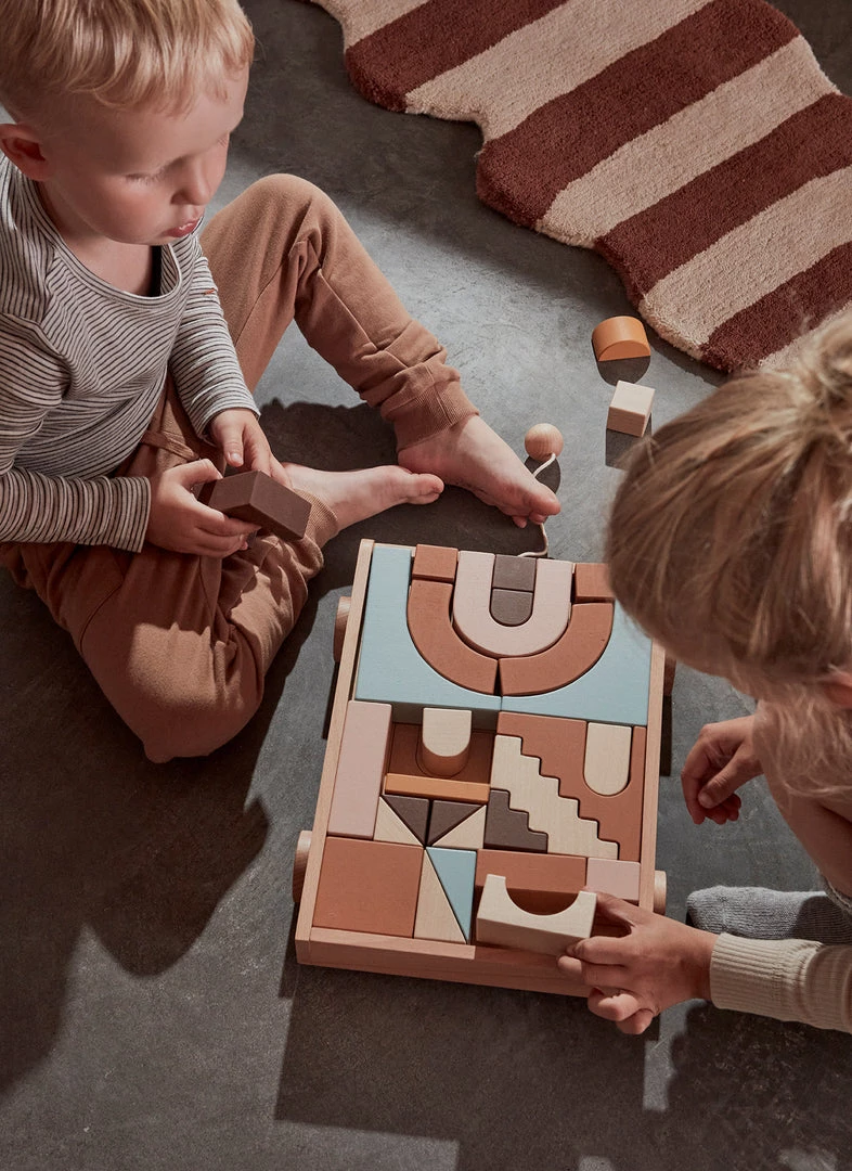 Wooden Rainbow Wagon on wheels filled with wooden blocks in cute colors, must be a dream for every child. Keep the blocks on the fine wagon in beech when the play is set.